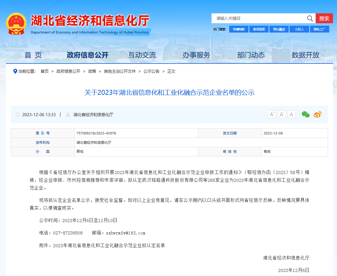近日,根据《省经信厅办公室关于组织开展2023年湖北省信息化和工业化融合示范企业申报工作的通知》(鄂经信办函[2023]58号),湖北省经济和信息化厅发布“关于2023年湖北省信息化和工业化融合示范企业名单的公示”。