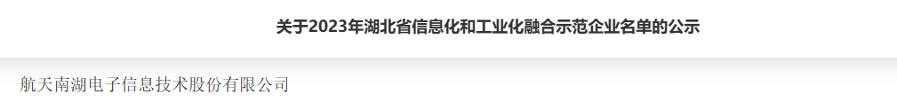 航天南湖电子信息技术股份有限公司入围“2023年湖北省信息化和工业化融合示范企业公示名单”。