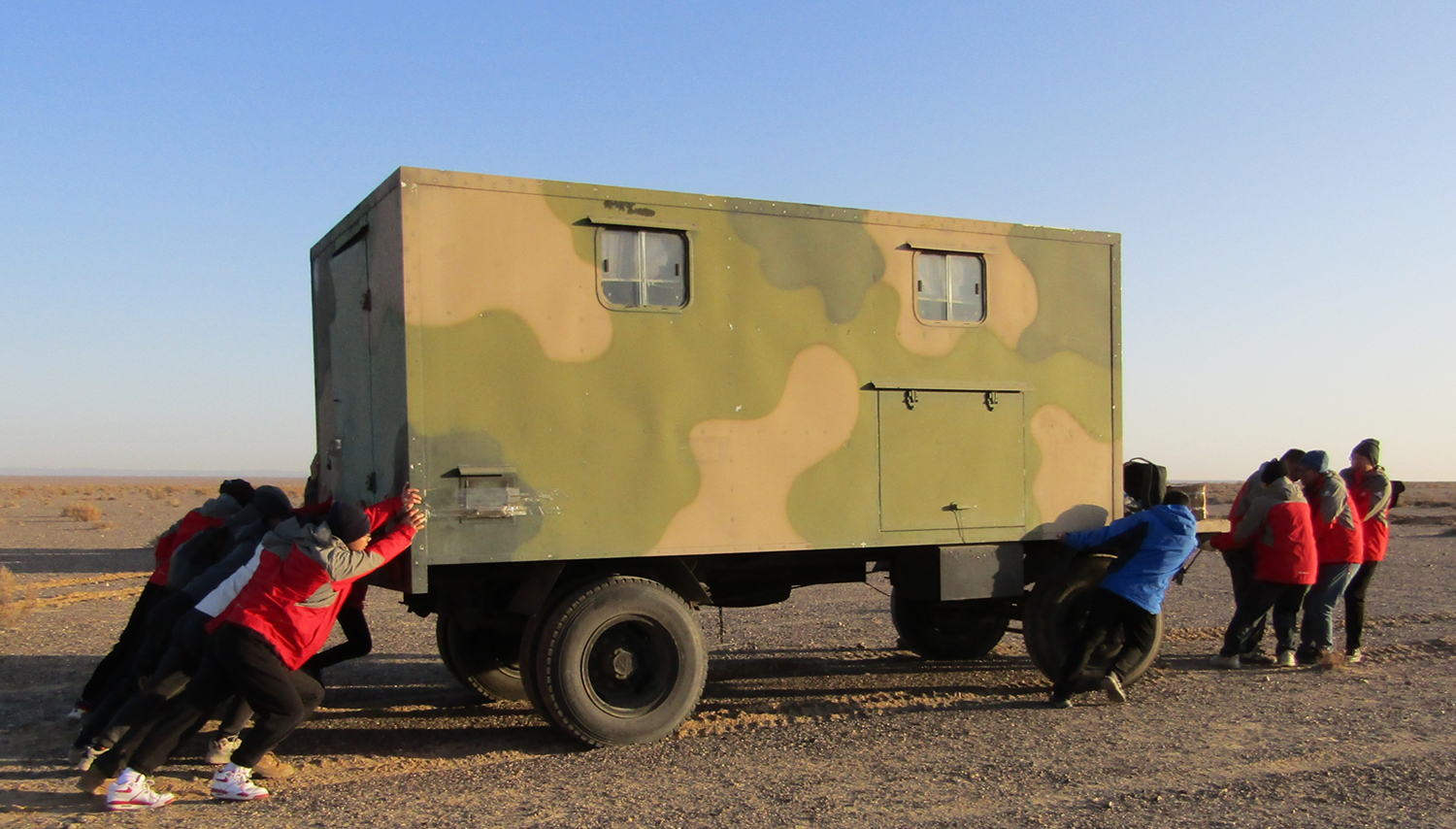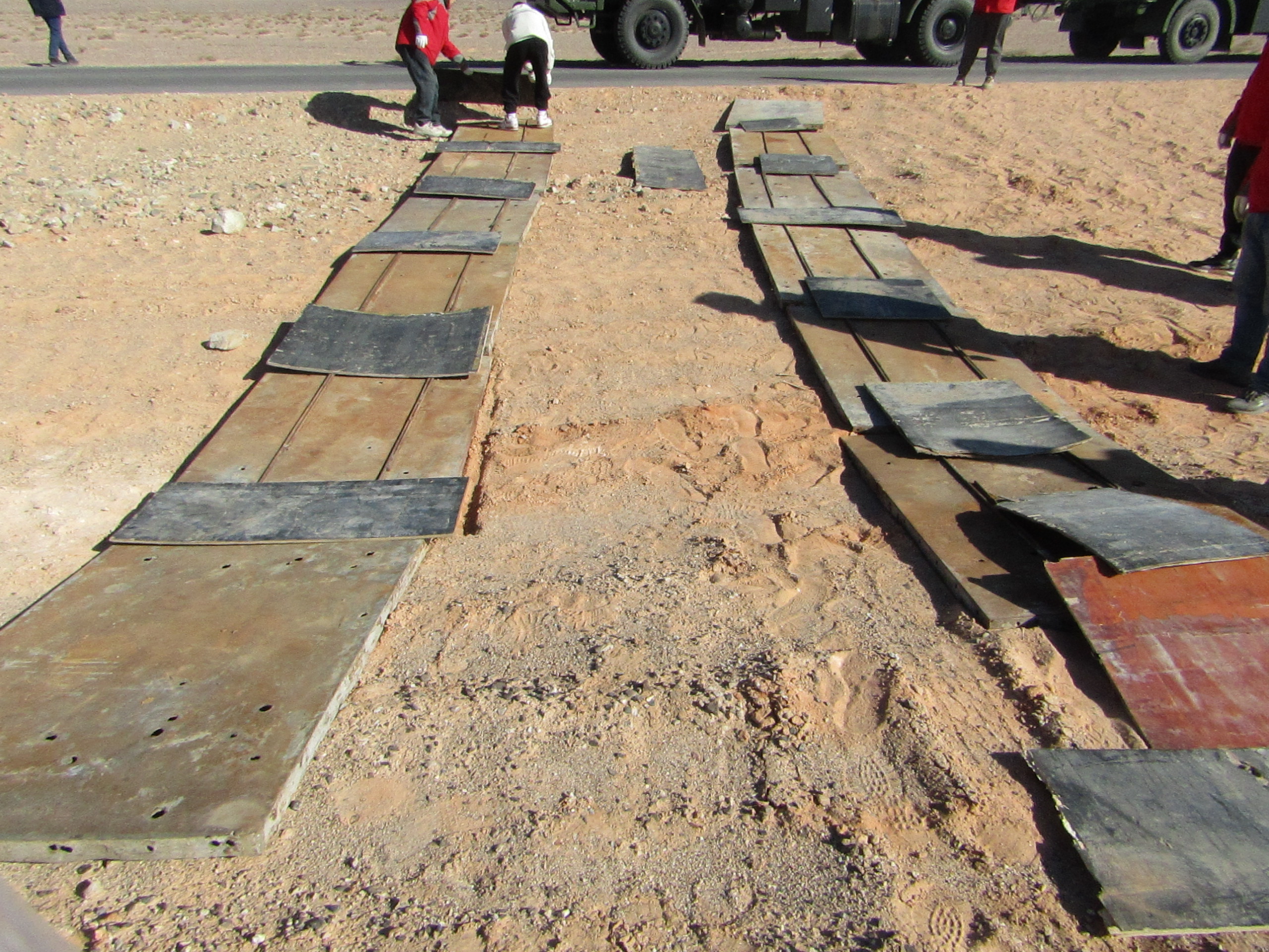 第三天,我们兵分两路。一路从驻地小镇上的废弃工厂收集了一些金属板,另一路采买可用于手工切割的小型器械。身强力壮的队员们纷纷化身“五金专家”,将形态各异的废板切割成大小趋近一致的“好板”。一块块“好板”被我们铺在沙窝旁的地面,形成引导车辆上岸的车轨。“一!二!三!”伴随着一声声整齐的加油“号子”,我们一鼓作气、连拖带推,将工作车顺着车轨一点点地推挪出了沙窝,稳稳当当地停在了我们临时铺就的停车坪上。