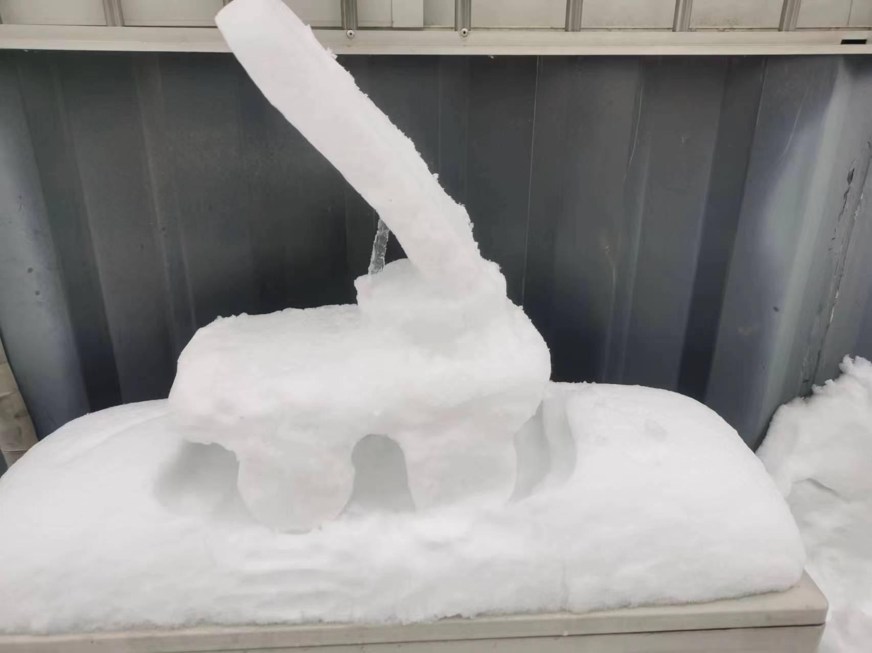 不知觉间,凛冬到来,突击队接连展开性能测试、实地保障、产品竞技等一系列任务,工作节点紧凑、复杂情况频出,队伍始终紧绷着一根弦。在紧张的氛围里,一点小趣味都会起到舒缓心弦的作用。一位巧思的队员用雪堆砌了一个产品模型,就放在工作的帐篷之外,与挺立于大地上的天线车遥相对望。